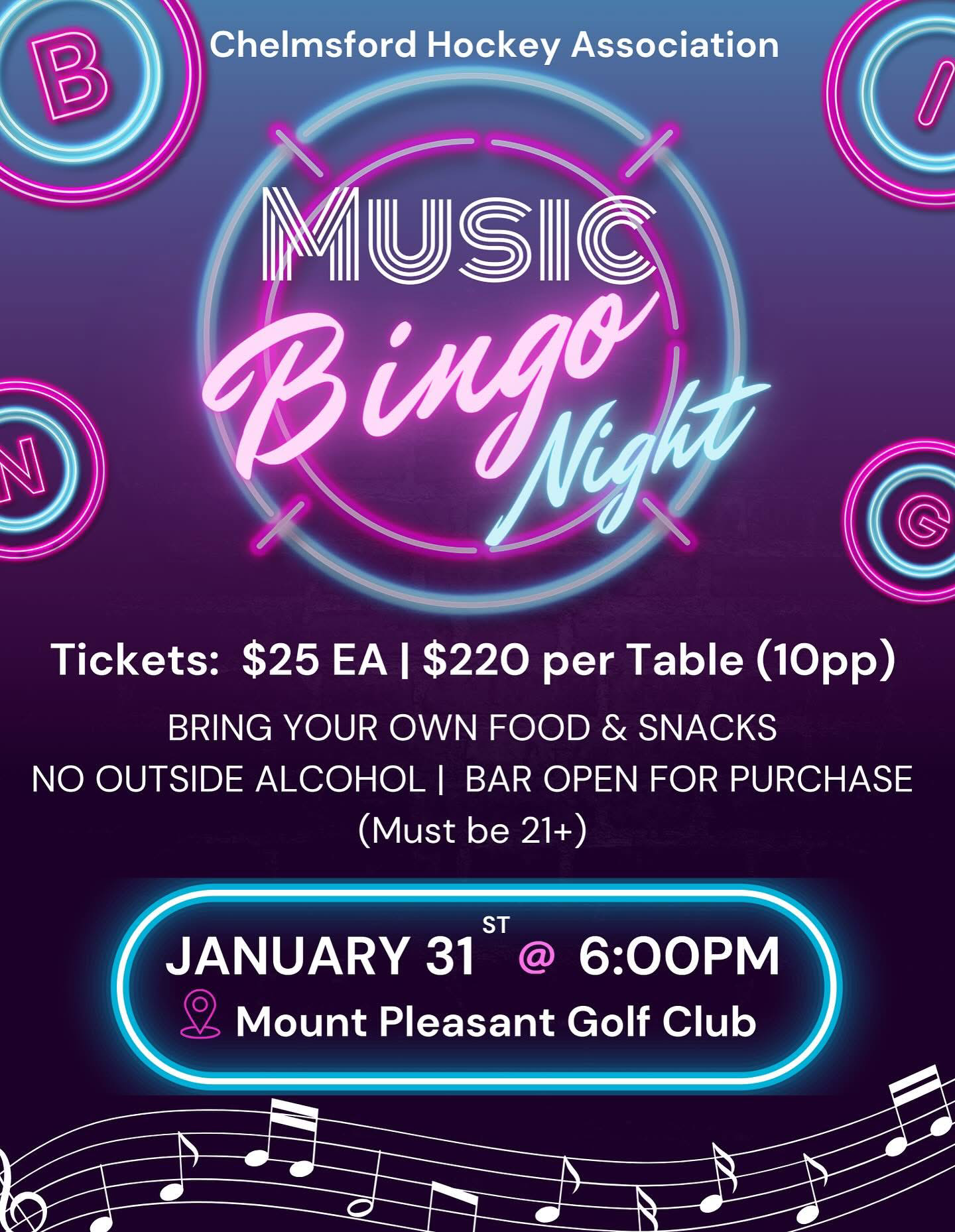 Please join us on January 31st @ 6:00 PM at Mount Pleasant Country Club for a fun night of Music Bingo!